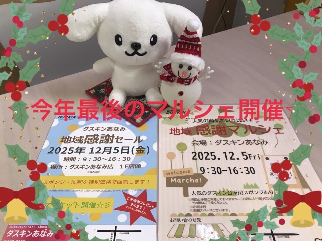 12月5日金曜日に年内最後のマルシェを開催します!年末の大掃除に活躍する洗剤やスポンジをお買い得価格で販売予定☆
